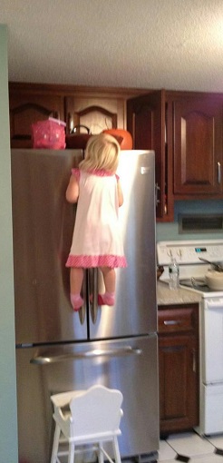 This photo was taken several years ago – after a successful Trick or Treating venture. Not one to be outsmarted by her Mom who had put the candy on top of the fridge for safekeeping, Julia quickly plotted her path to sugary bliss. She dragged the highchair over to the fridge, climbed up the highchair, and scaled that mountain. Execution was flawless, and the rewards were sweet.