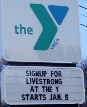 Riding past my local Y last week, I was glad to see this sign promoting the LiveSTRONG at the YMCA program. This program is “designed to help adult cancer survivors reclaim their total health.” Participants in the program meet twice a week “to regain their physical, emotional, and spiritual strength.” That’s why I love the idea of this program: there is an acknowledgment that cancer patients need to heal on a number of levels. Cancer affects every nook and cranny of a person’s life and LiveSTRONG at the YMCA aims to address a variety of challenges cancer patients face.